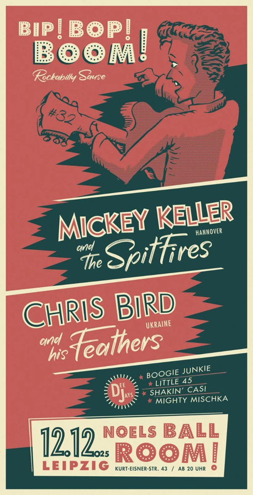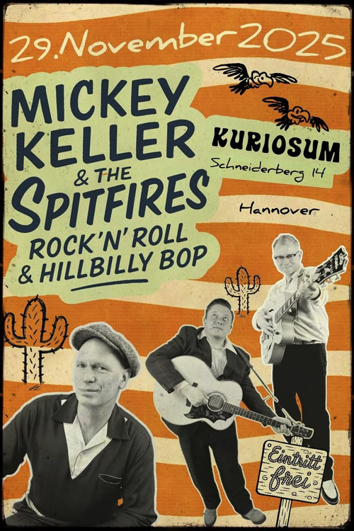 MICKEY KELLER & The SPITFIRES machen Boom ohne Schlagzeug, und klingen so authentisch nach der Geburt des Rockabilly, dass sie ihn auch selber genauso erfunden haben könnten. Mickeys unverwechselbare Stimme wird einigen aus Zeiten bekannt vorkommen, in denen er als Poor Boy oft den Gesangspart beim legendären Randy Rich übernommen hat. Die Jungs haben auch ne frisch gebackene Platte im Gepäck und kommen damit auf einem mürrischen Esel aus dem Norden gallopiert.